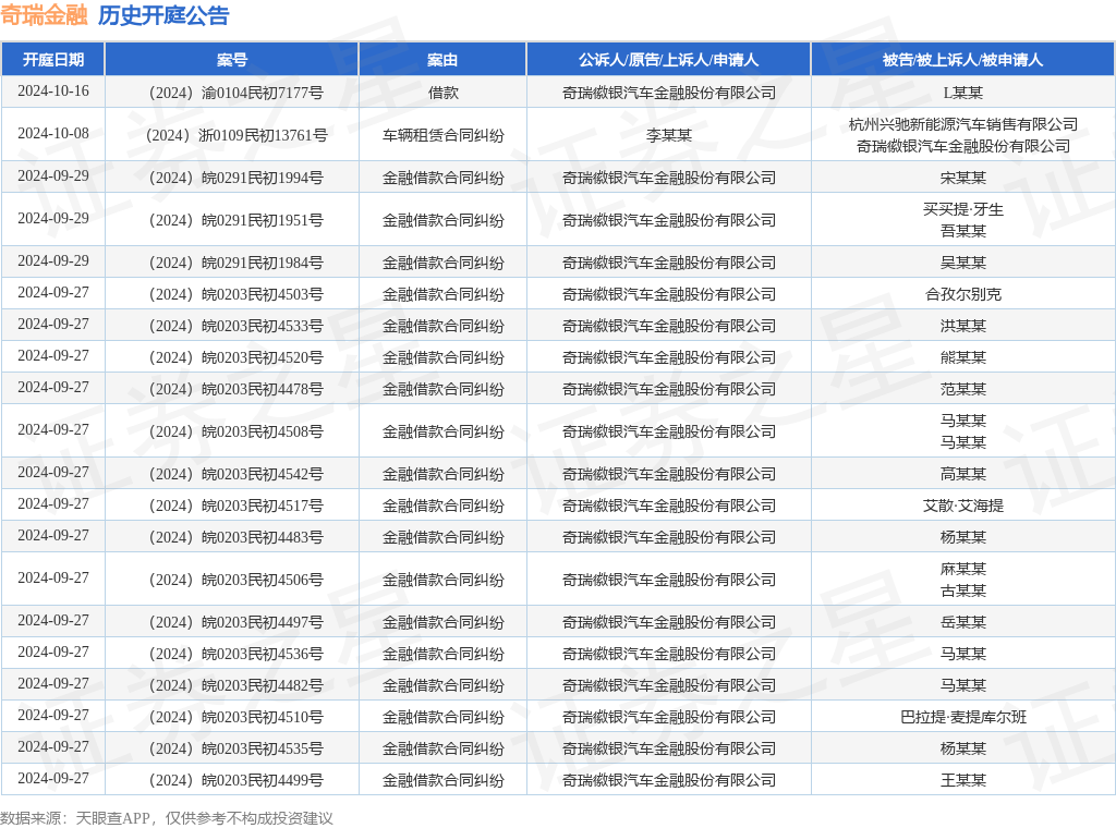 本站消息,根据天眼查APP显示,近日公布了一则奇瑞徽银汽车金融股份有限公司作为被告/被上诉人的开庭公告,详细内容如下: