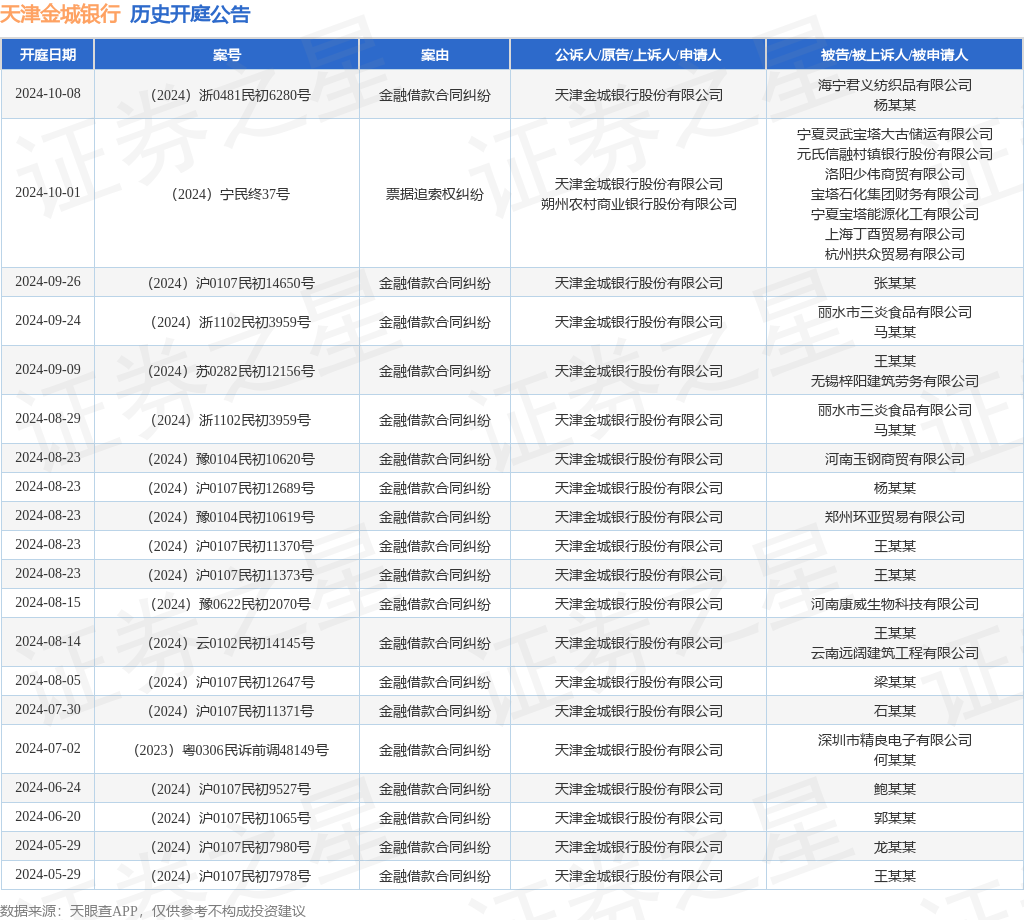 本站消息,根据天眼查APP显示,近日公布了一则天津金城银行股份有限公司作为原告/上诉人的开庭公告,详细内容如下: